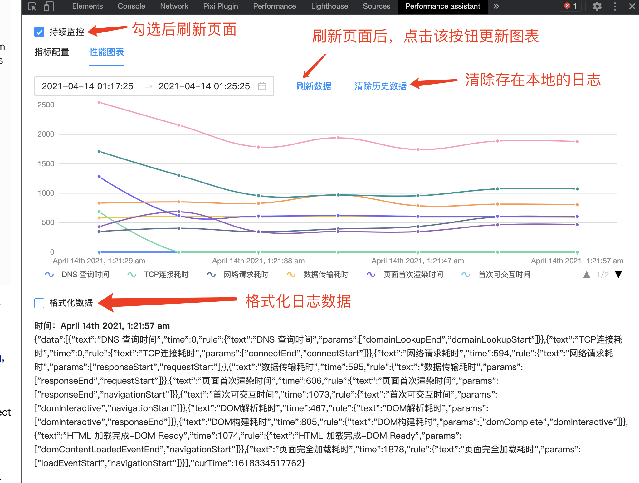 勾选“持续监控”后,刷新页面,插件会记录每一次页面加载后的数据,并呈现可视化图表方便观察变化趋势。日志数据存在本地,不用的历史数据可以清除。