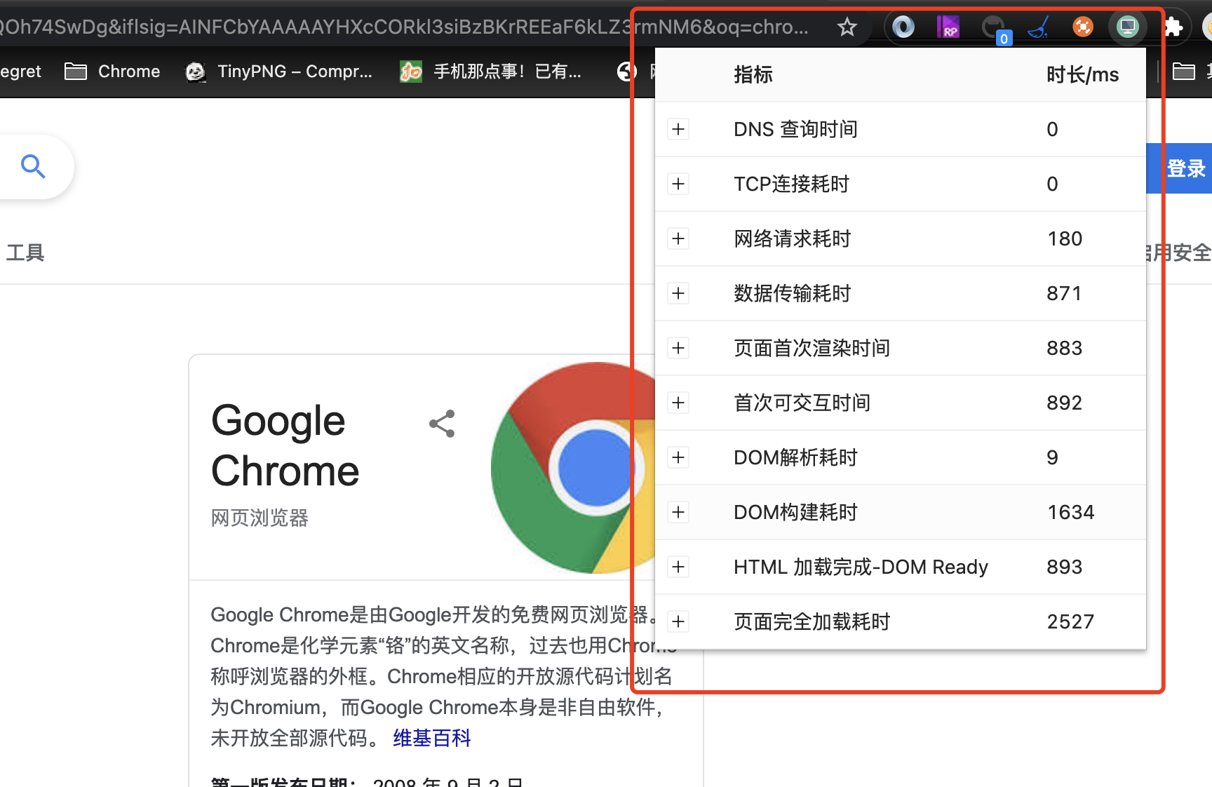 刷新页面之后,点击右上角插件 icon ,可以查看加载性能数据如下:(指标都是按照 performance.timing 现有属性值来的,指标名称和参与计算的属性释义可参考《Web 性能优化-首屏和白屏时间》、《Navigation Timing》)