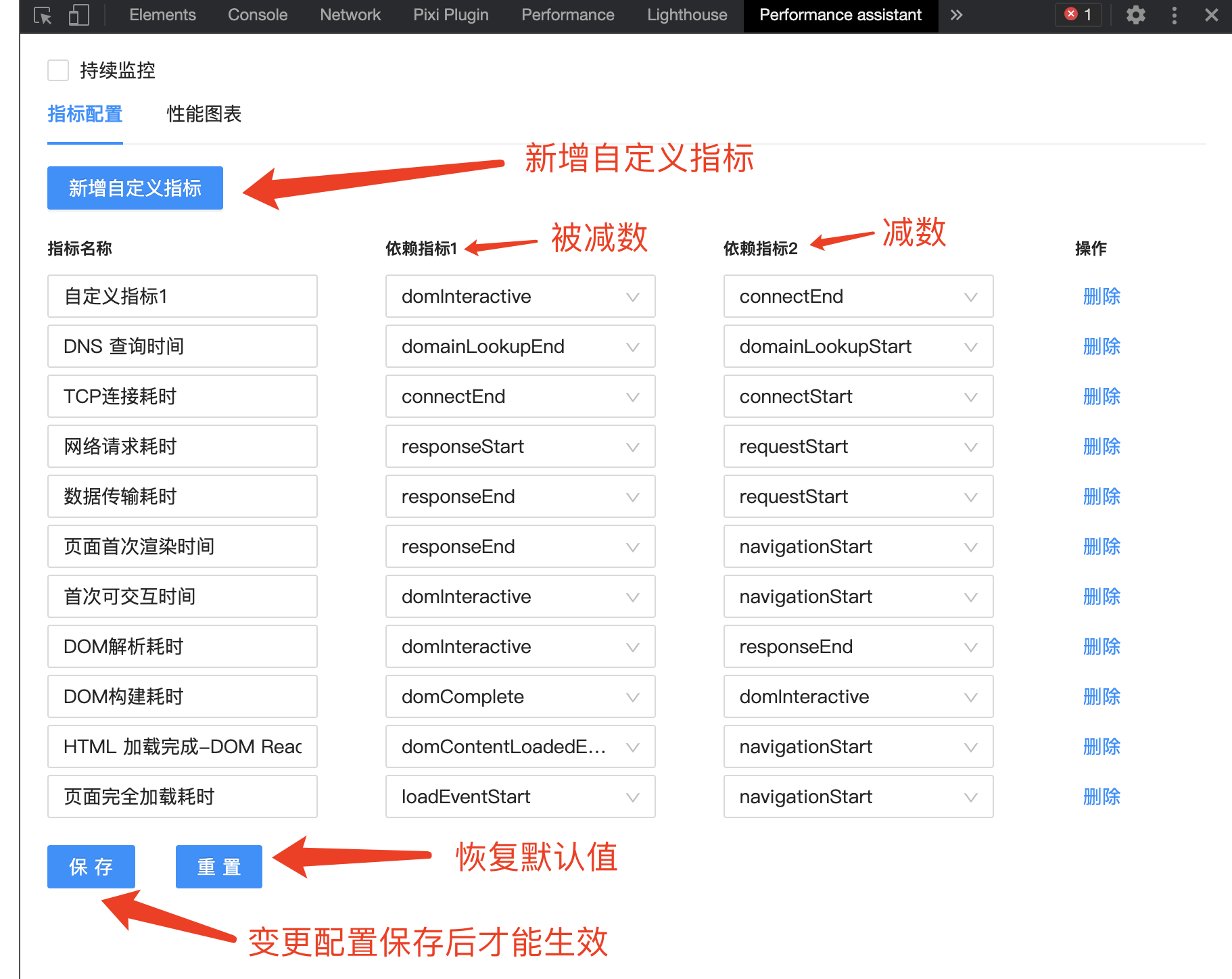 由于不同应用场景,对指标的定义可能不同,插件也提供了自定义指标的能力,可以打开开发者工具,选择 Performance assistant 这个tab,进行更多操作。包括新增自定义指标,删除已有指标,或者对已有默认指标进行编辑。当然你也不用担心会改乱掉,点击下方的重置按钮就能让所有指标恢复默认值: