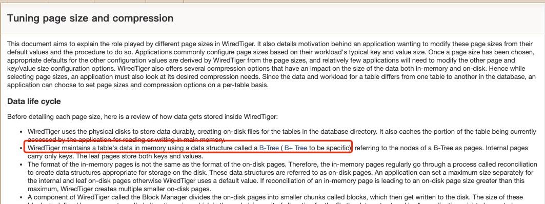 而从 WiredTiger 官网文档,我们可以知道:WiredTiger 使用的是 B+ 树作为其存储结构。