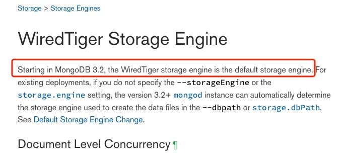 通过查阅资料,我从 MongoDb 的官网和 WiredTiger 官网找到了答案。MongoDb 官网关于存储引擎(Storage Engine)的描述写道:从 MongoDb 3.2 版本开始,其使用了 WiredTiger 作为其默认的存储引擎。
