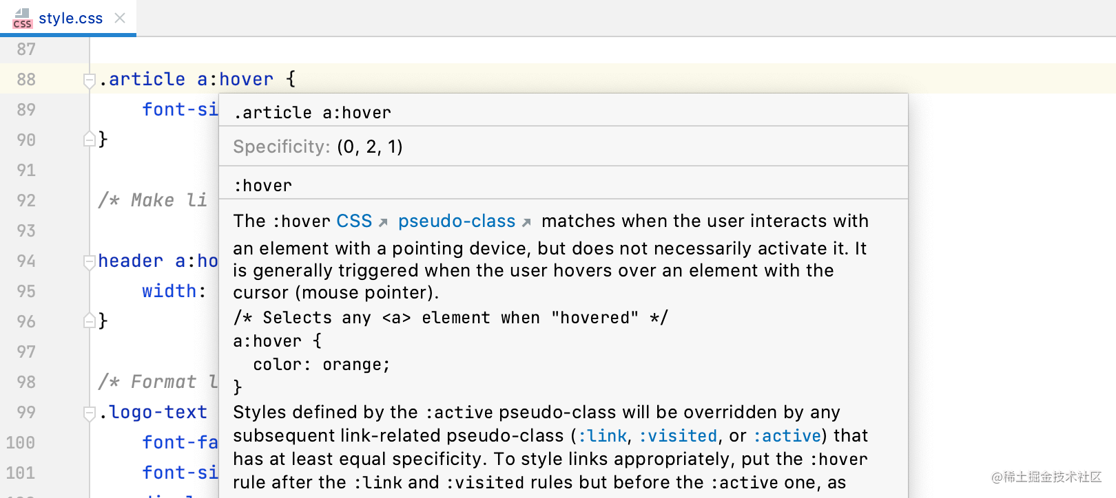 使用样式表时,现在可以查看选择器的特异性 – 只需将鼠标悬停在要查看的选择器上即可。 或者,将焦点放在选择器上,按 F1 在文档弹出窗口中查看这些信息。